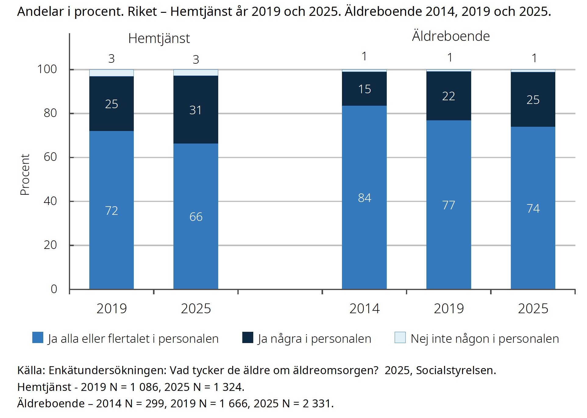 Samtidigt ser bilden av kompetensen mycket mörkare ut. Bland anhöriga till personer med hemtjänst svarar nu 66 procent att alla eller flertalet i personalen har den kunskap och kompetens som behövs. 2019 var andelen 72 procent. För anhöriga till personer på äldreboenden går utvecklingen åt samma håll: där har andelen som upplever att personalen har tillräcklig kompetens sjunkit från 84 procent 2014 till 74 procent 2025.